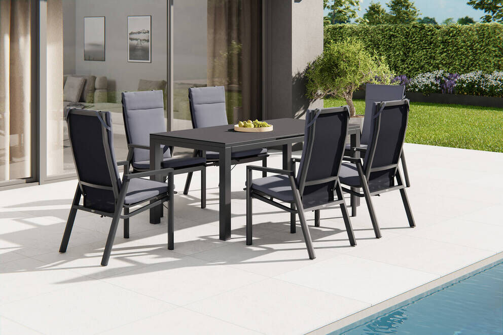 SIENA GARDEN Miros/Valencia Garten-Essgruppe, anthrazit, Alu/Ranotex-Gewebe, Ausziehtisch 180/240 x 90 cm, 6 Stapelsessel
