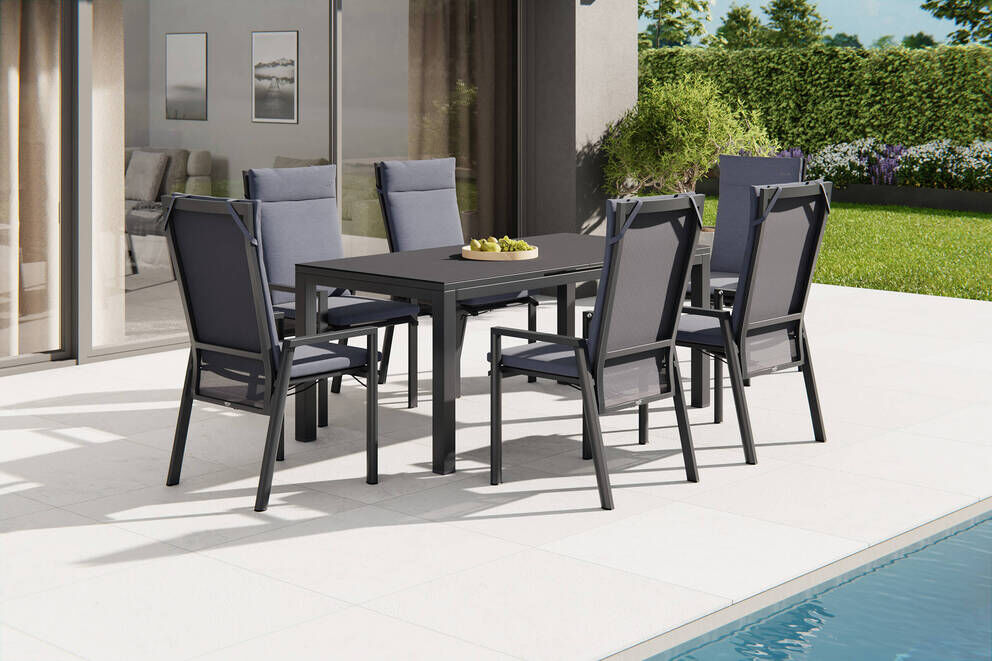Die Valencia Dining Sessel ergänzen den Tisch perfekt. Sie bieten mit ihren ca. 68x59x112 cm eine komfortable Sitzgelegenheit, die durch ihre stufenlose Verstellbarkeit jeden Ihrer Gäste optimalen Sitzkomfort ermöglicht. Das anthrazitfarbene Aluminiumgestell harmoniert wunderbar mit den grauen, n Polstern und sorgt für eine moderne Optik, die in jedem Garten Akzente setzt.