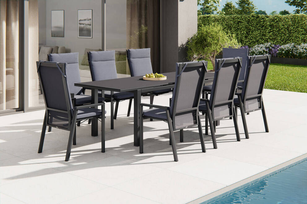 Die im Set enthaltenen acht Valencia Dining Sessel ergänzen den Tisch perfekt und laden mit ihren inklusiven Kissen und der stufenlosen Verstellbarkeit zu langen, komfortablen Abenden ein. Das ebenfalls anthrazitfarbene Aluminiumgestell ist pulverbeschichtet und verspricht hohe Stabilität sowie Langlebigkeit.