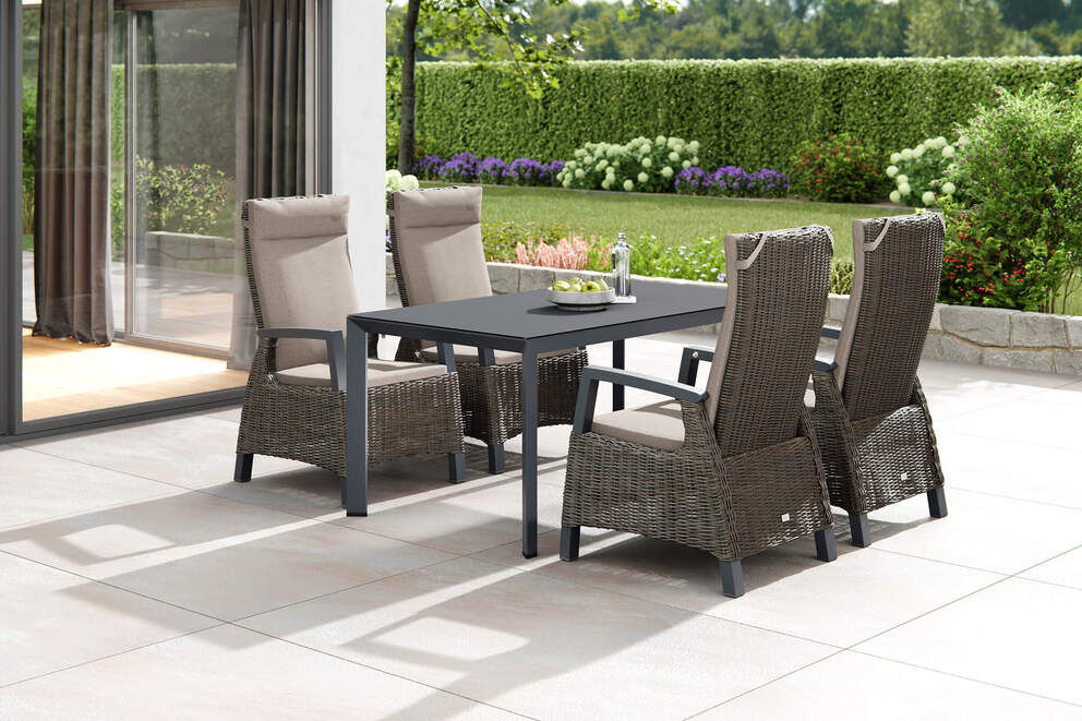 Die vier dazugehörigen Sessel bieten dank ihrer ergonomischen Formgebung und den weichen Polstern einen ausgezeichneten Sitzkomfort. Das verwendete Gardino®-Geflecht ist ein Garant für Langlebigkeit und Witterungsbeständigkeit, sodass Sie unbeschwerte Stunden im Freien genießen können. Die Stühle sind darüber hinaus platzsparend stapelbar und leicht zu handhaben.
