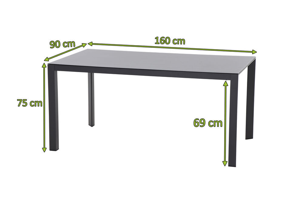 Wer das Besondere liebt ist mit diesem Esstisch bestens bedient. Der Tisch bietet mit seinen Maßen von ca. 160 x 90 x 75 cm Platz für ca. 4-6 Personen - so steht dem gemütlichen Mittagessen mit der Familie nichts mehr im Wege. Das Gestell wurde aus pulverbeschichtetem Aluminium in matt anthrazit hergestellt, was den Tisch besonders haltbar macht. Die Tischplatte besteht aus hochwertigem Glas, Keramikpulver beschichtet während die Tischbeine für ein weiteres optisches Highlight sorgen. Der Tisch hat ein Gewicht von ca. 25 kg. Die Fußkappen bestehen aus schwarzem Kunststoff und schützen den Boden vor unschönen Kratzern beim Verrücken des Möbelstücks.