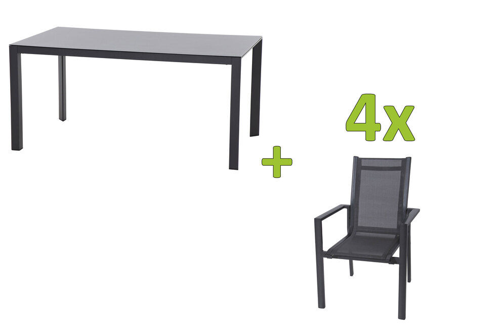 Die SIENA GARDEN Ricon Gartenessgruppe ist die perfekte Verbindung von Funktionalität und Eleganz für Ihren Außenbereich. Das Set besteht aus einem großzügig bemessenen SIENA GARDEN Esstisch mit einer ca. 160x90 cm großen Tischplatte aus hochwertigem Glas (ca. 5 mm) mit einer Beschichtung aus Keramikpulver und vier bequemen OUTFLEXX Stapelsesseln, die für höchsten Sitzkomfort sorgen. Diese Kombination bietet die ideale Grundlage für gemütliche Stunden im Freien, ob beim gemeinsamen Essen, bei entspannten Gesprächen oder einfach nur, um die Sonne zu genießen.