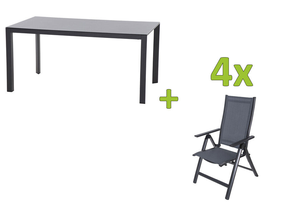 Zu diesem Tisch gehören vier OUTFLEXX Klappstühle, die mit ihrer atmungsaktiven Bespannung aus Textilene und den mehrfach verstellbaren Rückenlehnen höchsten Sitzkomfort garantieren. Sie sind klappbar und somit leicht zu verstauen, wenn mehr Platz benötigt wird. Zudem sind die Sessel dank des korrosionsbeständigen Materials extrem witterungsbeständig und für den Einsatz unter freiem Himmel prädestiniert.