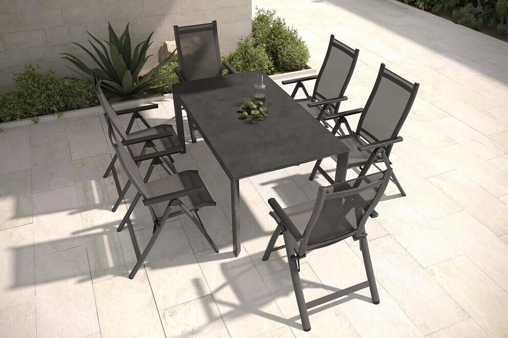 Zu diesem Tisch gehören vier OUTFLEXX Klappstühle, die mit ihrer atmungsaktiven Bespannung aus Textilene und den mehrfach verstellbaren Rückenlehnen höchsten Sitzkomfort garantieren. Sie sind klappbar und somit leicht zu verstauen, wenn mehr Platz benötigt wird. Zudem sind die Sessel dank des korrosionsbeständigen Materials extrem witterungsbeständig und für den Einsatz unter freiem Himmel prädestiniert.