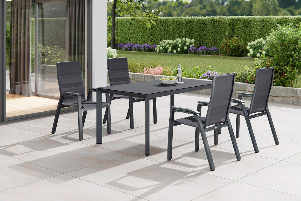 Erleben Sie mit der SIENA GARDEN Ricon/Milano Esstischgarnitur eine perfekte Kombination aus Funktion und Eleganz. Diese sorgfältig zusammengestellte Garnitur bringt eine stilvolle Atmosphäre in jeden Garten und jede Terrasse. Die anthrazitfarbenen Aluminiumrahmen des Tisches und der Sessel bieten nicht nur eine moderne Optik, sondern gewährleisten auch Langlebigkeit und Stabilität.