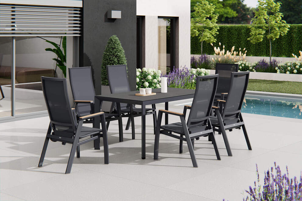 Erleben Sie mit der SIENA GARDEN Ricon/Rondo Esstischgarnitur ein stilvolles und komfortables Esserlebnis im Freien. Dieses Set vereint Eleganz mit Funktionalität und transformiert jeden Garten in eine einladende Dining-Oase. Die harmonische Kombination aus anthrazitfarbenem Aluminium und hochwertigen Teakholz-Armlehnen bringt modernen Chic in Ihre Außengestaltung.