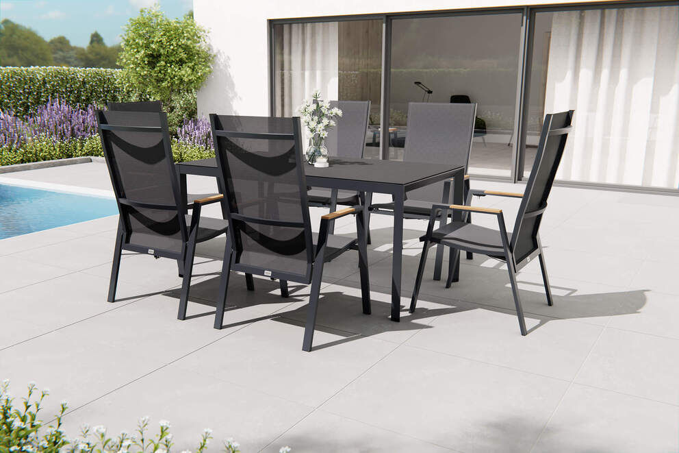 Das elegante Anthrazit und die klaren Linien des Tisches sowie der Stühle fügen sich harmonisch in jedes Gartenambiente ein. |