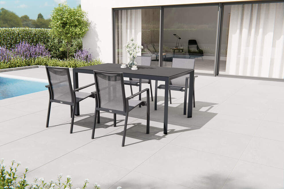 Die anthrazitfarbene Oberfläche des Tisches, gefertigt aus robustem Aluminium und abgerundet durch eine hochwertige Tischplatte mit Keramikpulverbeschichtung, verspricht Langlebigkeit und ist zugleich ein Blickfang. Die feine Textur der Tischplatte schafft nicht nur eine ansprechende Optik, sondern macht sie auch extrem leicht zu reinigen und widerstandsfähig gegenüber den Elementen.