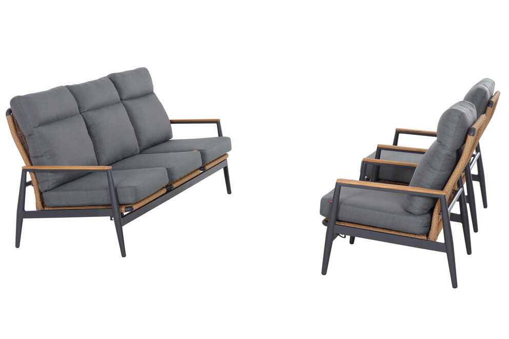Entdecken Sie die perfekte Symbiose aus stilvollem Design und praktischer Funktionalität mit der SIENA GARDEN Roma Loungegarnitur. Dieses exklusive, dreiteilige Set verwandelt jeden Garten oder Terrassenbereich in eine Oase der Entspannung. Die harmonische Kombination aus matt anthrazitfarbenem Aluminium und natürlichem Gardino-Geflecht schafft ein ästhetisch ansprechendes Gesamtbild, das durch die warmen Holztöne der Teakholz-Armlehnen abgerundet wird.