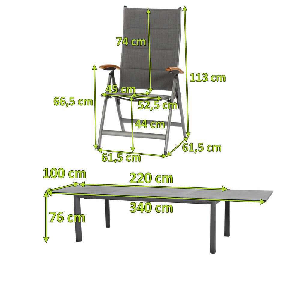 Der Klappsessel ist nicht nur ein Highlight in Sachen Optik, sondern weiß auch durch seinen Komfort und durch seine qualitative Verarbeitung zu überzeugen. Für ein komfortables Sitzen sorgt die hochwertige Texfabric Bespannung, die den Klappsessel auch ohne Auflagen äußerst bequem macht. Außerdem ist die Rückenlehne 10-fach verstellbar, sodass der Sessel je nach Bedarf in eine Sitz- oder Liegeposition gebracht werden kann. Das zeitlose Design aus einem Aluminiumgestell mit einer Textilenbespannung in der Farbe grau, macht den Sessel zu einem optischen Highlight für jede Terrasse. Armlehnen aus Teakholz ergänzen das edle Design. Dank der verwendeten Materialien hat dieser Klappstuhl das sehr geringe Eigengewicht von ca. 5,9 kg, wodurch er leicht zu handhaben ist und bei Bedarf schnell und einfach zusammengeklappt und platzsparend verstaut werden kann.