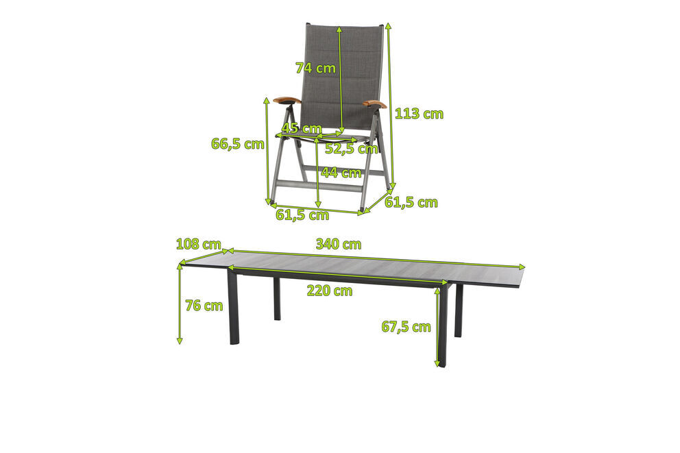Wer in größeren Dimensionen denkt ist mit diesem Tisch bestens bedient. Der Tisch bietet mit seiner rechteckigen Form und Maßen von ca. 220/340 x 108 x 76 cm Platz für einen gemütlichen Nachmittag mit Ihrer Familie in der Sonne. Der Tisch lässt sich durch Ziehen an beiden Seiten und Hochklappen der integrierten, mittleren Tischplatte bis auf eine Länge von ca. 340 cm ausziehen - perfekt, wenn sich noch spontaner Besuch ankündigt oder Sie einen schönen Grillabend mit Freunden und Nachbarn planen. Das Gestell wurde aus pulverbeschichtetem Aluminium in matt graphit hergestellt, was den Tisch besonders haltbar macht. Die Tischplatte in Woodlook besteht aus hochwertigem Glas das mit Keramikpulver beschichtet wurde und besitzt eine Stärke von ca. 10 mm. Die quadratisch geformten Tischbeine sorgen für ein weiteres optisches Highlight. Die Fußkappen bestehen aus schwarzem Kunststoff und schützen den Boden vor unschönen Kratzern beim Verrücken des Möbelstücks. Die Unterschubhöhe beträgt ca. 65,5 cm - so kann man gemütlich mit vielen Arten von Sesseln und Stühlen an diesem Tisch Platz nehmen. Der Tisch hat ein Gewicht von ca. 73 kg, und ist somit perfekt gegen unerwartete Windstöße geschützt.