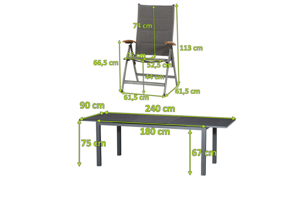 Der Klappsessel ist nicht nur ein Highlight in Sachen Optik, sondern weiß auch durch seinen Komfort und durch seine qualitative Verarbeitung zu überzeugen. Für ein komfortables Sitzen sorgt die hochwertige Texfabric Bespannung, die den Klappsessel auch ohne Auflagen äußerst bequem macht. Außerdem ist die Rückenlehne 10-fach verstellbar, sodass der Sessel je nach Bedarf in eine Sitz- oder Liegeposition gebracht werden kann. Das zeitlose Design aus einem Aluminiumgestell mit einer Textilenbespannung in der Farbe grau, macht den Sessel zu einem optischen Highlight für jede Terrasse. Armlehnen aus Teakholz ergänzen das edle Design. Dank der verwendeten Materialien hat dieser Klappstuhl das sehr geringe Eigengewicht von ca. 5,9 kg, wodurch er leicht zu handhaben ist und bei Bedarf schnell und einfach zusammengeklappt und platzsparend verstaut werden kann.