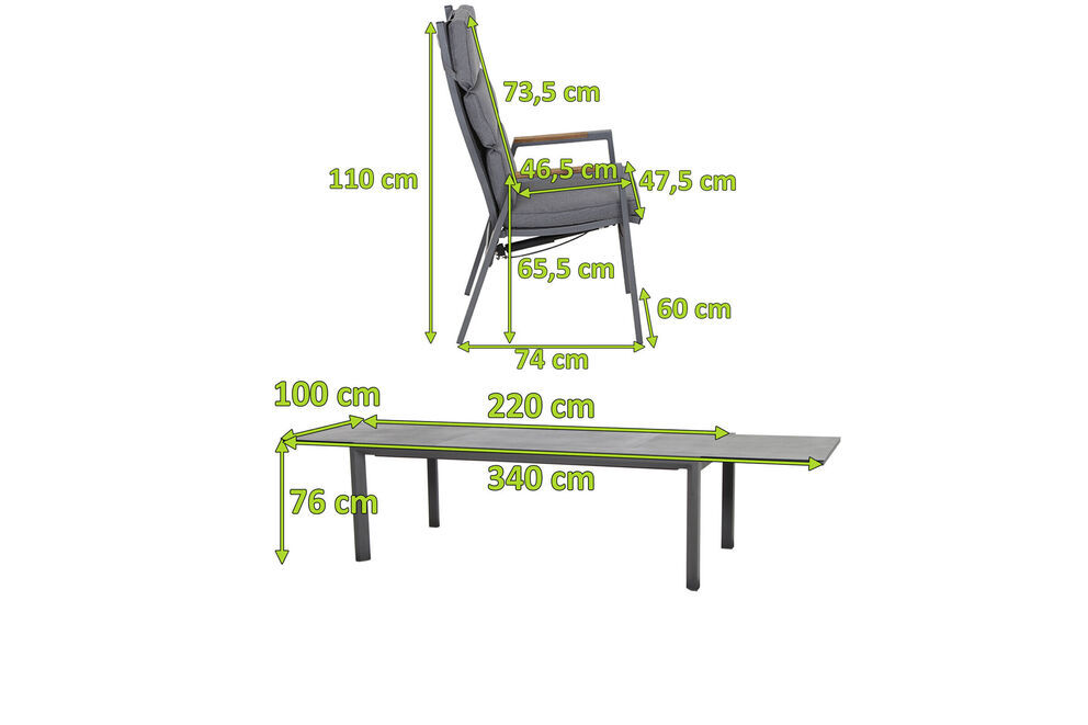 Wer das Besondere liebt ist mit diesem Ausziehtisch bestens bedient. Der Tisch bietet mit seinen Maßen von ca. 220/340x108x76 cm Platz für bis zu 10 Personen - so steht dem gemütlichen Mittagessen mit der Familie nichts mehr im Wege. Das Gestell wurde aus pulverbeschichtetem Aluminium in matt graphit hergestellt, was den Tisch besonders haltbar macht. Die Tischplatte besteht aus Glas Keramikpulver beschichtet in slate look. Die Unterschubhöhe beträgt ca. 65,5 cm - so kann man gemütlich mit vielen Arten von Sesseln an diesem Tisch Platz nehmen. Der Tisch hat ein Gewicht von ca. 73 kg, und ist somit perfekt gegen Windstöße geschützt.