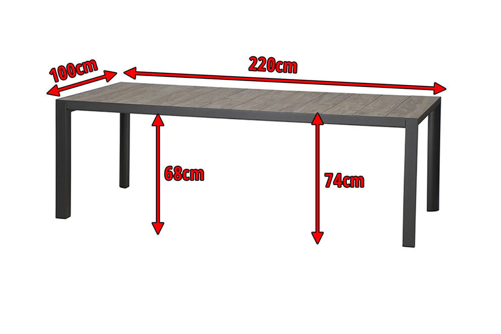 Wer das Besondere liebt ist mit diesem Esstisch bestens bedient. Der Tisch bietet mit seinen Maßen von ca. 220 x 100 x 74 cm Platz für 6-8 Personen - so steht dem gemütlichen Mittagessen mit der Familie nichts mehr im Wege. Das Gestell wurde aus pulverbeschichtetem Aluminium in matt anthrazit hergestellt, was den Tisch besonders haltbar macht. Die Tischplatte besteht aus hochwertigem Keramik in Holzoptik in der Farbe washed grey, während die dreieckig geformten Tischbeine für ein weiteres optisches Highlight sorgen. Die Unterschubhöhe beträgt ca. 66,5 cm - so kann man gemütlich mit vielen Arten von Sesseln an diesem Tisch Platz nehmen. Der Tisch hat ein Gewicht von ca. 64 kg, und ist somit perfekt gegen Windstöße geschützt. Die Fußkappen bestehen aus schwarzem Kunststoff und schützen den Boden vor unschönen Kratzern beim Verrücken des Möbelstücks.