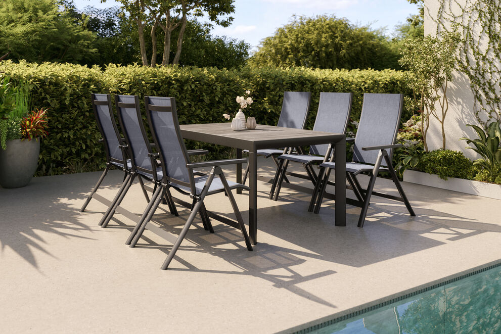 Für erstklassigen Sitzkomfort sorgen die sechs OUTFLEXX Klappstühle, die mit ihrem ergonomischen Design und praktischen Funktionen überzeugen. Die Sitz- und Rückenflächen bestehen aus hochwertigem, luftdurchlässigem Textilene, das ein angenehmes und s Sitzgefühl bietet. Die 7-fach verstellbare Rückenlehne ermöglicht eine individuelle Anpassung für optimalen Komfort – ob zum Essen oder Entspannen. Die pulverbeschichteten Aluminiumgestelle sind nicht nur besonders leicht, sondern auch wetterfest und langlebig.