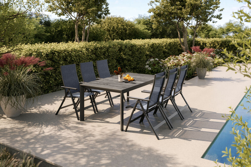 Genießen Sie stilvolle Stunden im Freien mit der hochwertigen SIENA GARDEN Silva Garten-Essgruppe. Diese moderne Outdoor-Sitzgruppe überzeugt mit ihrem edlen Design, langlebigen Materialien und hohem Komfort. Das Set besteht aus einem großzügigen Diningtisch und sechs bequemen Klappstühlen, die perfekt aufeinander abgestimmt sind. Ob gemütliche Familienessen oder gesellige Abende mit Freunden – mit dieser Essgruppe verwandeln Sie Ihre Terrasse oder Ihren Garten in eine stilvolle Wohlfühloase.