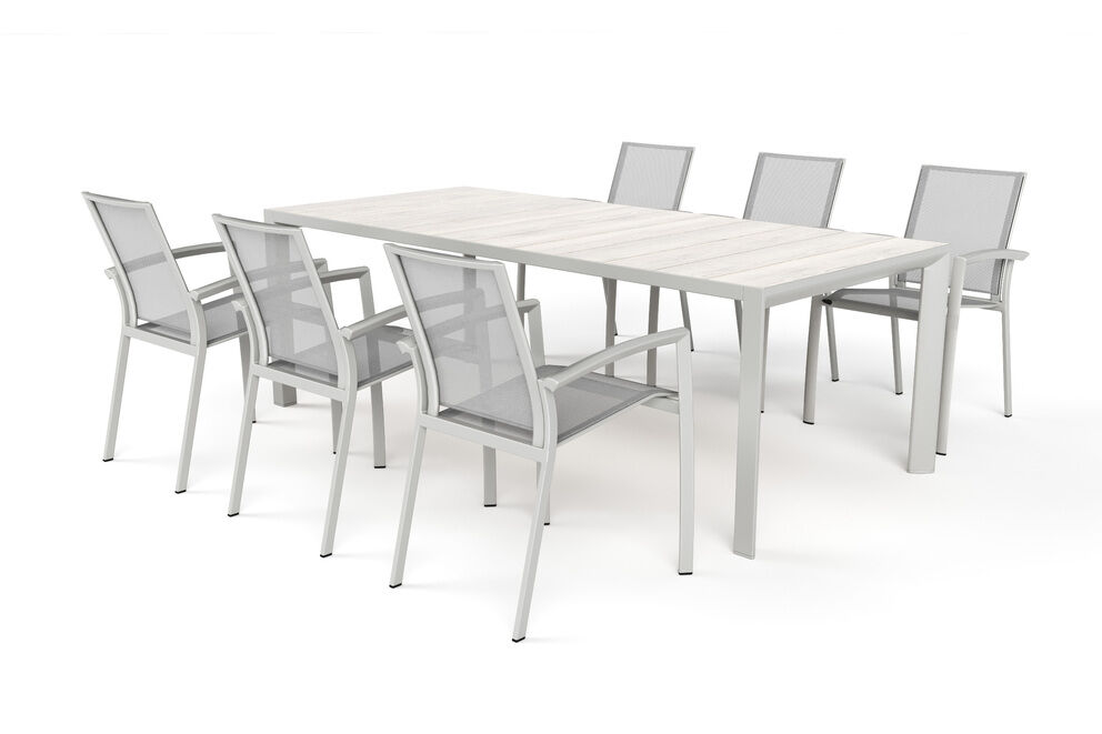 Komplettiert wird die Gruppe durch sechs komfortable Velia Dining-Sessel mit pulverbeschichtetem Aluminiumgestell in matt weiß-grau und luftdurchlässigem Ranotex®-Gewebe. Dieses Material ist besonders atmungsaktiv, UV-beständig und überzeugt durch seine angenehme Haptik auch an heißen Sommertagen. Dank der Stapelbarkeit lassen sich die Sessel platzsparend verstauen – perfekt für wechselhaftes Wetter oder die Einlagerung in der kühleren Jahreszeit. Die Sessel werden bereits fertig montiert geliefert, sodass Sie direkt loslegen können.