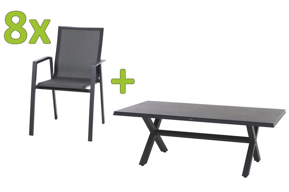 Entdecken Sie den perfekten Mittelpunkt für Ihre Outdoor-Geselligkeit mit der SIENA GARDEN Sincro/Reno Gartenessgruppe. Dieses exklusive Set, bestehend aus dem Dining Tisch Sincro und acht Stapelsesseln Reno, bringt Eleganz und Funktionalität in Ihren Außenbereich. Mit seiner harmonischen Farbgebung in Matt Anthrazit und Titan setzt es moderne Akzente in Ihrem Garten oder auf Ihrer Terrasse.