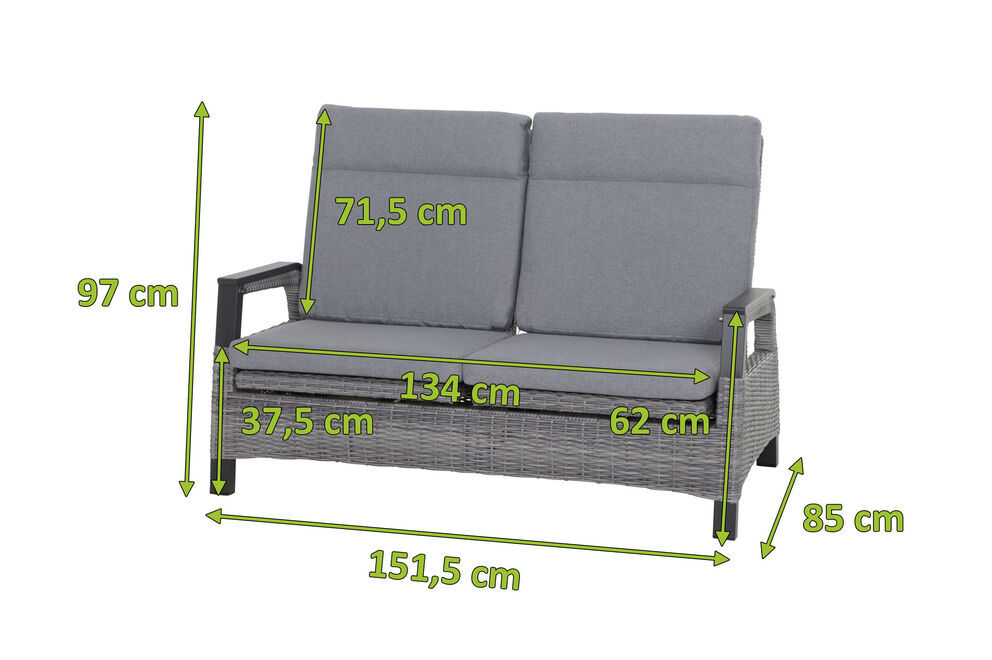 Einfach zurücklehnen und entspannen. Egal ob Sie die Beine hochlegen und ein gutes Buch in der Sonne lesen, gemütlich zusammen mit Freunden ein Kaffeekränzchen halten oder in gepflegter Atmosphäre den Alltag gemächlich an sich vorbeiziehen lassen möchten. Dieser bequeme 2-Sitzer mit einem Gesamtmaß von ca. 85 x 151,5 x 97 cm ist der ideale Begleiter und lädt Sie jederzeit zum Verweilen ein. Die breite Sitzfläche bietet genügend Platz für 2 Personen. Bei einer Sitzhöhe von ca. 37,5 cm ohne Kissen lässt es sich herrlich entspannen, allein oder zu zweit. Die praktischen Armlehnen bieten zusätzlichen Komfort und ist zudem ein echter Hingucker. Passende, extra starke Kissen verleihen den Sitzmöbeln ein unvergleichliches Sitzerlebnis.