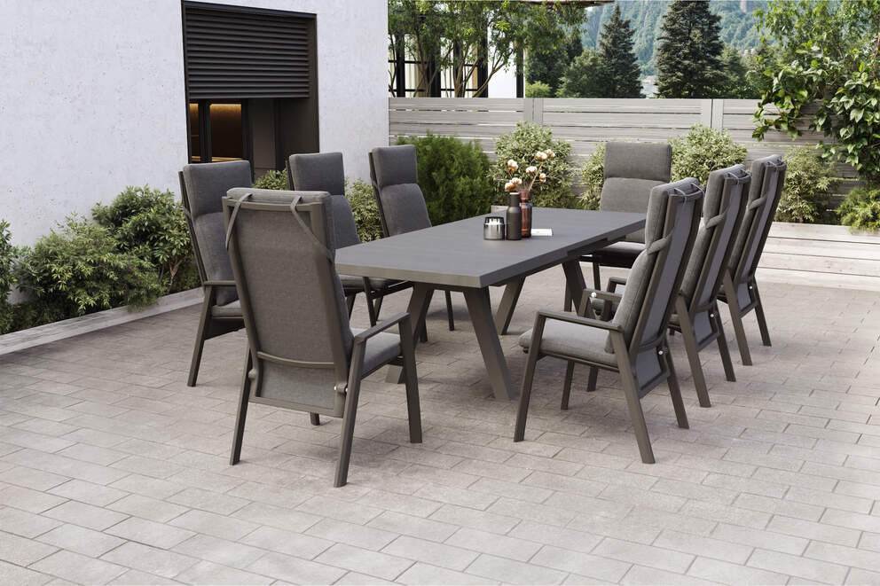 Die acht ergonomisch geformten Valencia Dining Sessel ergänzen den Tisch perfekt und sorgen für höchsten Sitzkomfort. Das pulverbeschichtete Aluminiumgestell in matt anthrazit kombiniert mit dem strapazierfähigen Textilgewebe in dunkelgrau sorgt für ein harmonisches Gesamtbild. Die Rückenlehnen sind stufenlos verstellbar und ermöglichen eine entspannte Sitzposition – ideal für lange Abende im Garten. Die Kissen in der modernen Farbe "salt & pepper" sind nicht nur bequem, sondern auch UV-beständig und wasserabweisend, sodass sie den Anforderungen des Outdoor-Alltags mühelos standhalten.