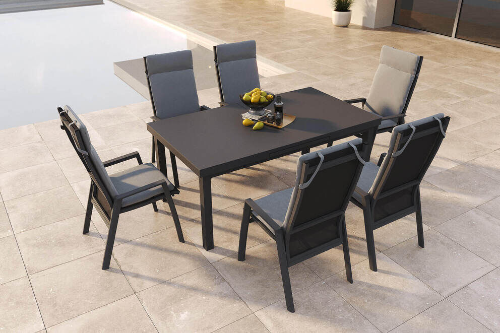 Ob zum geselligen Beisammensein oder zum Zurücklehnen und Entspannen – mit dieser Garten-Essgruppe setzen Sie auf hochwertige Verarbeitung, modernes Design und durchdachte Funktion. Die Kombination aus langlebigen Materialien wie Aluminium, Glas und Textilgewebe sowie die elegante Farbgebung in Anthrazit und Grau verleihen Ihrem Außenbereich eine zeitlos-moderne Note.