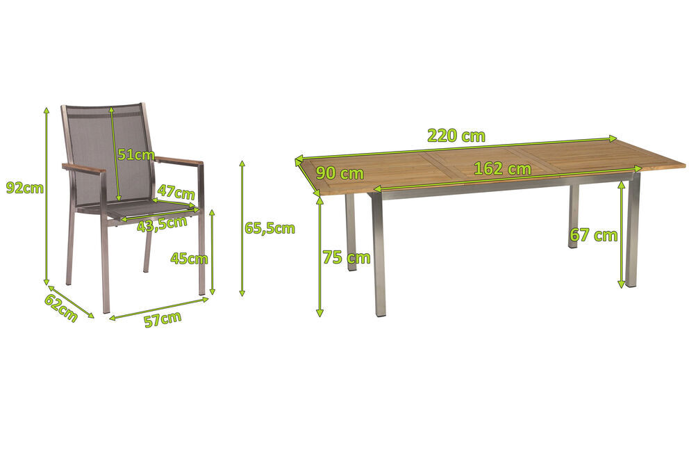STERN Cardiff Esstischgruppe, silber/silbergrau, Edelstahl/Textilen/Teakholz, Ausziehtisch 162/220 x 90 cm, 6 Stapelsessel