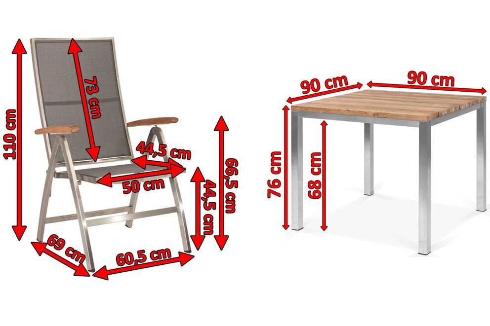 Das verwendete recycelte Teakholz verleiht dem Tisch einen ganz besonderen Charme. Die rustikal gebürstete Oberfläche sorgt dafür, dass die natürliche Struktur des Holzes erhalten bleibt und die Maserung besonders gut zum Vorschein kommt. Das Zusammenspiel aus dieser rustikalen Oberfläche und dem edlen 304er Edelstahl, verleiht dem Tisch sein besonderes Aussehen und sorgt dafür, dass er sich zu nahezu jeder Garteneinrichtung harmonisch kombinieren lässt. Mit den Maßen von ca. 90 x 90 x 76 cm bietet er ausreichend Platz für 4 Personen. Die Stärke der Tischplatte von ca. 3 cm und die ca. 5 x 5 cm dicken Tischbeine unterstreichen das Zusammenspiel aus rustikalen und edlen Elementen zusätzlich.
