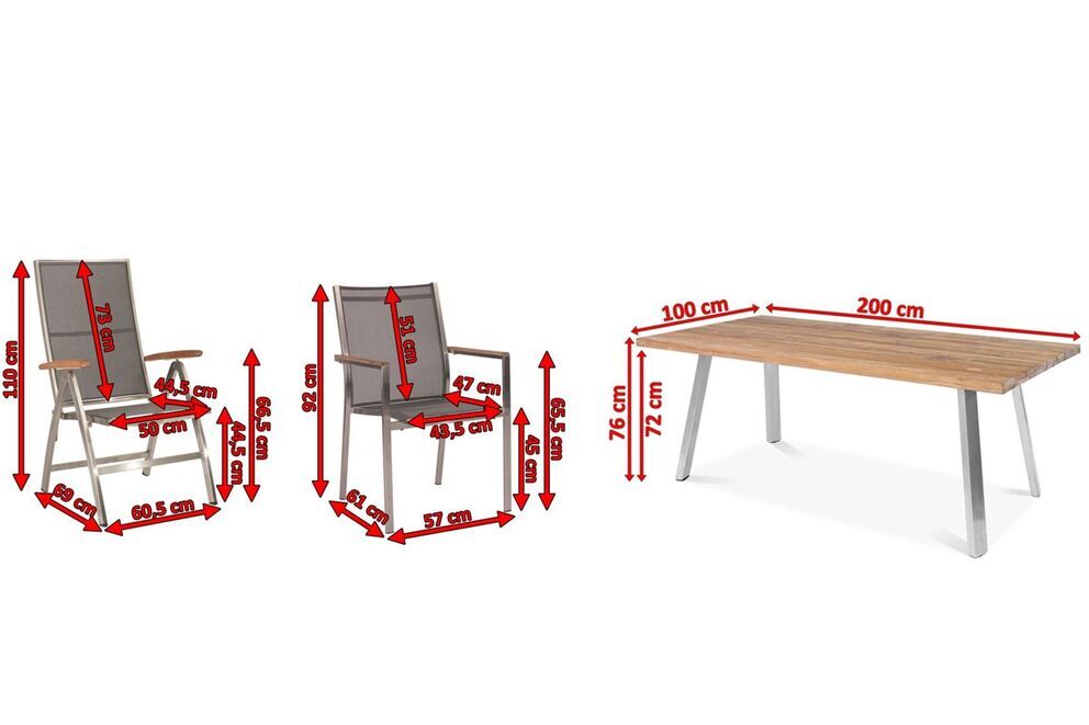 Die Sessel überzeugen nicht nur durch ihr zeitloses Design und die hochwertigen Materialien, sondern vor allem auch durch ihren Komfort und ihre Funktionalität. Mit einer maximalen Belastbarkeit von ca. 120 kg sind die Sessel zudem sehr stabil. Sie werden Ihnen durch ihre hohe Widerstandsfähigkeit gegen Wind und Wetter viele Jahre Freude bereiten. Das Textilengewebe in der Farbe Silbergrau ist formstabil, bequem und besonders pflegeleicht. Leichte Verschmutzungen lassen sich ganz einfach mit ein wenig Wasser wieder entfernen. Das für die Armlehnen verwendete Teakholz ist FSC-zertifiziert und stammt damit aus verantwortungsvollen Quellen. So können Sie sich guten Gewissens zurücklehnen und sich so richtig entspannen. Die Rückenlehne der Hochlehner lässt sich kinderleicht mehrfach verstellen und bietet damit einen hervorragenden Sitzkomfort. Je nach Bedarf können die Hochlehner zusammengeklappt und die Stapelsessel ineinander gestapelt, und somit platzsparend verstaut werden.