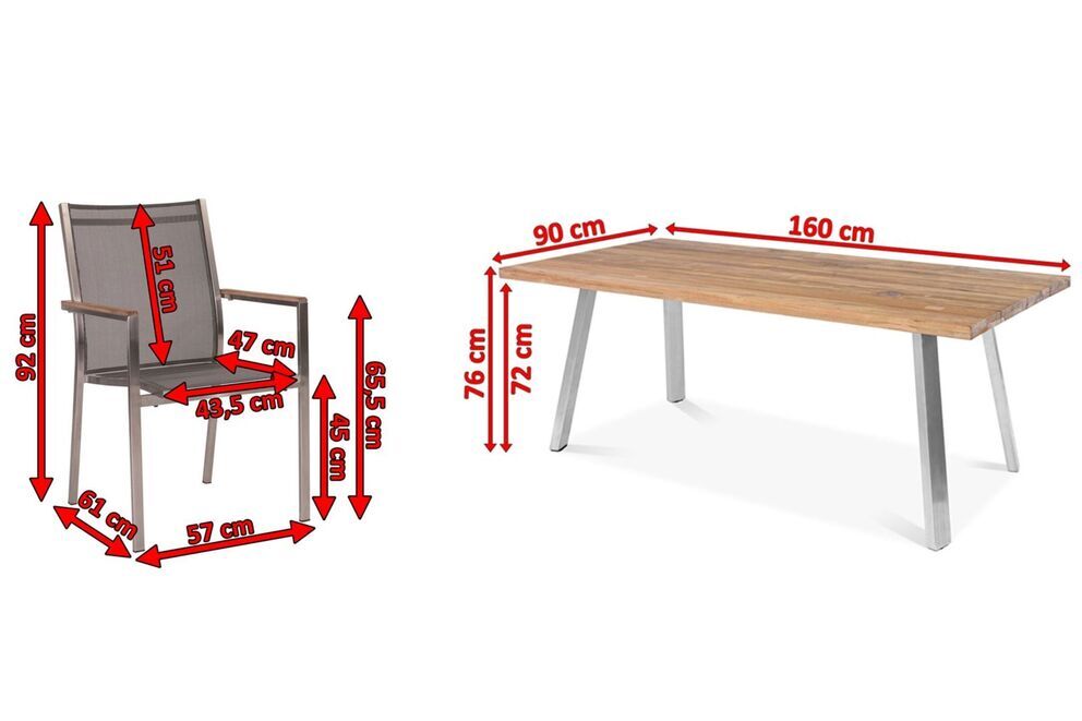 Die Kombination aus edlen, zeitlosen und rustikal, gemütlichen Elementen macht diese Esstischgruppe so besonders. Das Set besteht aus einem Esstisch der Marke OUTFLEXX mit den Maßen von ca. 160 x 90 x 76 cm und 6 Stapelsesseln der Marke Stern aus der Serie 'Cardiff'. Die hellen Farben des Gestells sind in Verbindung mit der Farbe des Teakholzes ein echter Hingucker und sorgen für eine zeitlose Frische. Dadurch lässt sich die Esstischgruppe wunderbar mit anderen Farben kombinieren. So bleibt Ihnen viel Raum für kreative Gestaltungsmöglichkeiten. Die hochwertigen Materialien und die sorgfältige Verarbeitung sorgen nicht nur für die besondere Optik dieser Esstischgruppe, sondern machen sie auch sehr stabil.