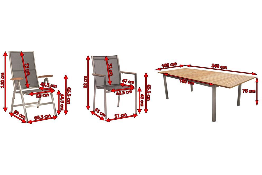 Die Sessel überzeugen nicht nur durch ihr zeitloses Design und die hochwertigen Materialien, sondern vor allem auch durch ihren Komfort und ihre Funktionalität. Mit einer maximalen Belastbarkeit von ca. 120 kg sind die Sessel zudem sehr stabil. Sie werden Ihnen durch ihre hohe Widerstandsfähigkeit gegen Wind und Wetter viele Jahre Freude bereiten. Das Textilengewebe in der Farbe Silbergrau ist formstabil, bequem und besonders pflegeleicht. Leichte Verschmutzungen lassen sich ganz einfach mit ein wenig Wasser wieder entfernen. Das für die Armlehnen verwendete Teakholz ist FSC-zertifiziert und stammt damit aus verantwortungsvollen Quellen. So können Sie sich guten Gewissens zurücklehnen und sich so richtig entspannen. Die Rückenlehne der Hochlehner lässt sich kinderleicht mehrfach verstellen und bietet damit einen hervorragenden Sitzkomfort. Je nach Bedarf können die Hochlehner zusammengeklappt und die Stapelsessel ineinander gestapelt, und somit platzsparend verstaut werden.