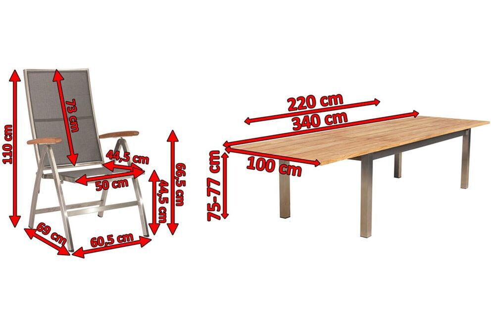 Bei dieser Esstischgruppe treffen besonders edle Materialien und zeitloses Design aufeinander. Das Set besteht aus einem Ausziehtisch der Marke OUTFLEXX mit den Maßen von ca. 220/340 x 100 x 75-77 cm und 6 Klappstühlen der Marke Stern aus der Serie 'Cardiff'. Die hellen Farben des Gestells sind in Verbindung mit der Farbe des Teakholzes ein echter Hingucker und sorgen für eine zeitlose Frische. Dadurch lässt sich die Esstischgruppe wunderbar mit anderen Farben kombinieren. So bleibt Ihnen viel Raum für kreative Gestaltungsmöglichkeiten. Die hochwertigen Materialien und die sorgfältige Verarbeitung sorgen nicht nur für die besondere Optik dieser Esstischgruppe, sondern machen sie auch sehr stabil.