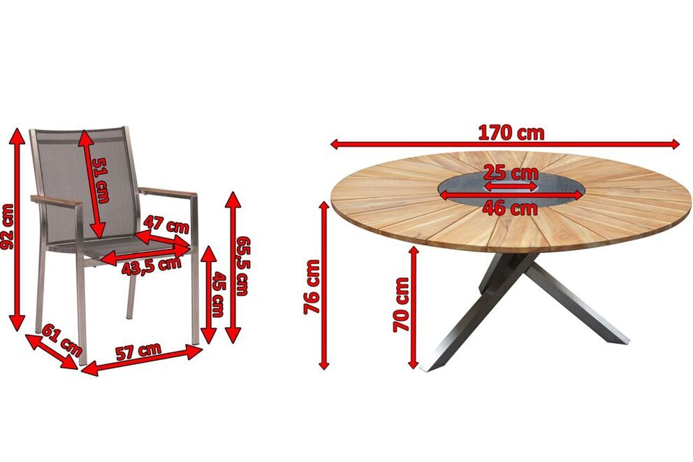 Bei dieser Esstischgruppe treffen besonders edle Materialien und zeitloses Design aufeinander. Das Set besteht aus einem Esstisch der Marke OUTFLEXX mit den Maßen von ca. Ø 170 x 76 cm und 6 Stapelsesseln der Marke Stern aus der Serie 'Cardiff'. Die hellen Farben des Gestells sind in Verbindung mit der Farbe des Teakholzes ein echter Hingucker und sorgen für eine zeitlose Frische. Dadurch lässt sich die Esstischgruppe wunderbar mit anderen Farben kombinieren. So bleibt Ihnen viel Raum für kreative Gestaltungsmöglichkeiten. Die hochwertigen Materialien und die sorgfältige Verarbeitung sorgen nicht nur für die besondere Optik dieser Esstischgruppe, sondern machen sie auch sehr stabil.