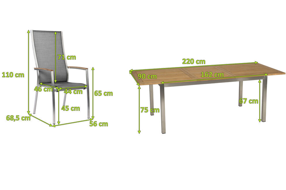Der Hersteller setzt dabei, neben dem minimalistischen Design, vor allem auf besonders hochwertige Materialien. Diese sind dabei ebenso robust wie edel. Das beginnt schon beim stabilen Rahmen: Durch den Einsatz von Edelstahl kann nicht nur die Optik überzeugen, sondern auch die hohe Robustheit. Der Gartentisch bietet mit seinen Maßen von ca. 162/220 x 90 cm bei einer Höhe von ca. 75 cm ausreichend Platz, um gemeinsam schöne Stunden bei einem Brunch im Garten zu verbringen. Das Gestell aus Edelstahl der Güteklasse 304 gibt dem Tisch mit seinen ca. 5 x 5 cm starken Tischbeinen eine besonders hohe Stabilität. Die Tischplatte besteht aus Teakholz und lässt sich durch einen geschmeidigen Butterfly-Auszug problemlos von ca. 162 cm auf ca. 220 cm verlängern, sodass Sie zahlreiche Plätze für Gäste schaffen. Die hochwertige Materialauswahl und die sorgfältige Verarbeitung sorgen nicht nur für die exklusive Optik dieses Ausziehtisches, sondern machen den Tisch auch sehr stabil. Genießen Sie mit gutem Gewissen entspannte Stunden im Garten - Das für diesen Tisch verwendete Teakholz stammt damit aus verantwortungsvoll bewirtschafteten Quellen.