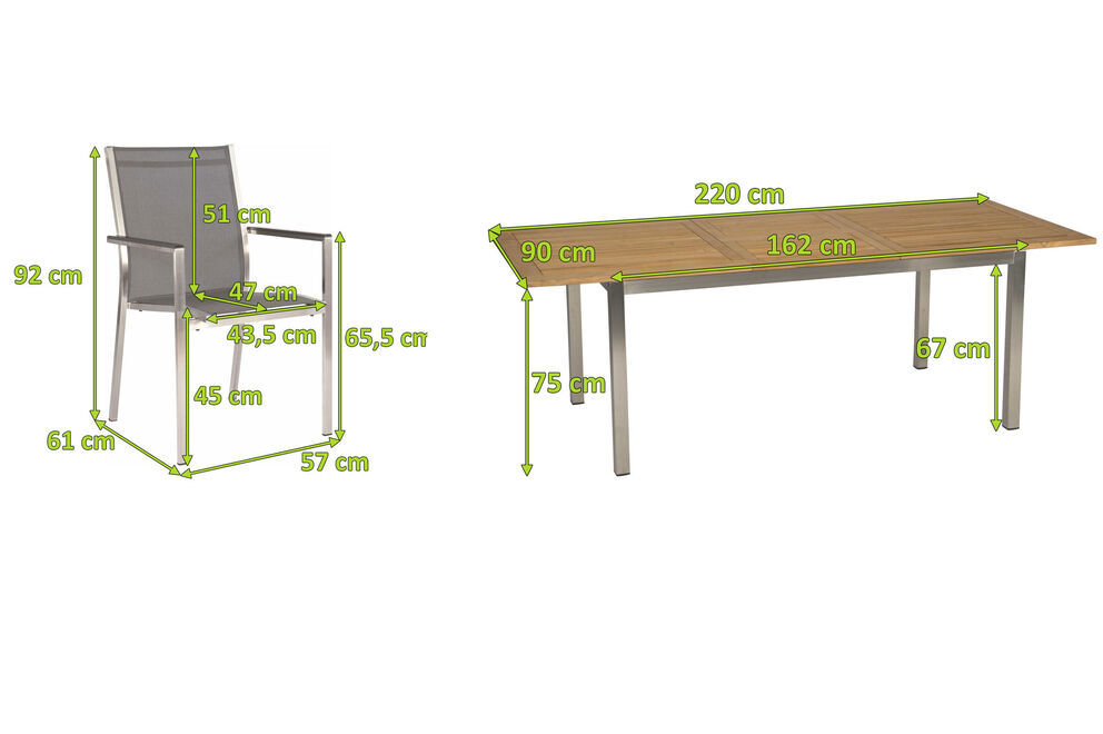 Der Hersteller setzt dabei, neben dem minimalistischen Design, vor allem auf besonders hochwertige Materialien. Diese sind dabei ebenso robust wie edel. Das beginnt schon beim stabilen Rahmen: Durch den Einsatz von Edelstahl kann nicht nur die Optik überzeugen, sondern auch die hohe Robustheit. Der Gartentisch bietet mit seinen Maßen von ca. 162/220 x 90 cm bei einer Höhe von ca. 75 cm ausreichend Platz, um gemeinsam schöne Stunden bei einem Brunch im Garten zu verbringen. Das Gestell aus Edelstahl der Güteklasse 304 gibt dem Tisch mit seinen ca. 5 x 5 cm starken Tischbeinen eine besonders hohe Stabilität. Die Tischplatte besteht aus Teakholz und lässt sich durch einen geschmeidigen Butterfly-Auszug problemlos von ca. 162 cm auf ca. 220 cm verlängern, sodass Sie zahlreiche Plätze für Gäste schaffen. Die hochwertige Materialauswahl und die sorgfältige Verarbeitung sorgen nicht nur für die exklusive Optik dieses Ausziehtisches, sondern machen den Tisch auch sehr stabil. Genießen Sie mit gutem Gewissen entspannte Stunden im Garten - Das für diesen Tisch verwendete Teakholz stammt damit aus verantwortungsvoll bewirtschafteten Quellen.