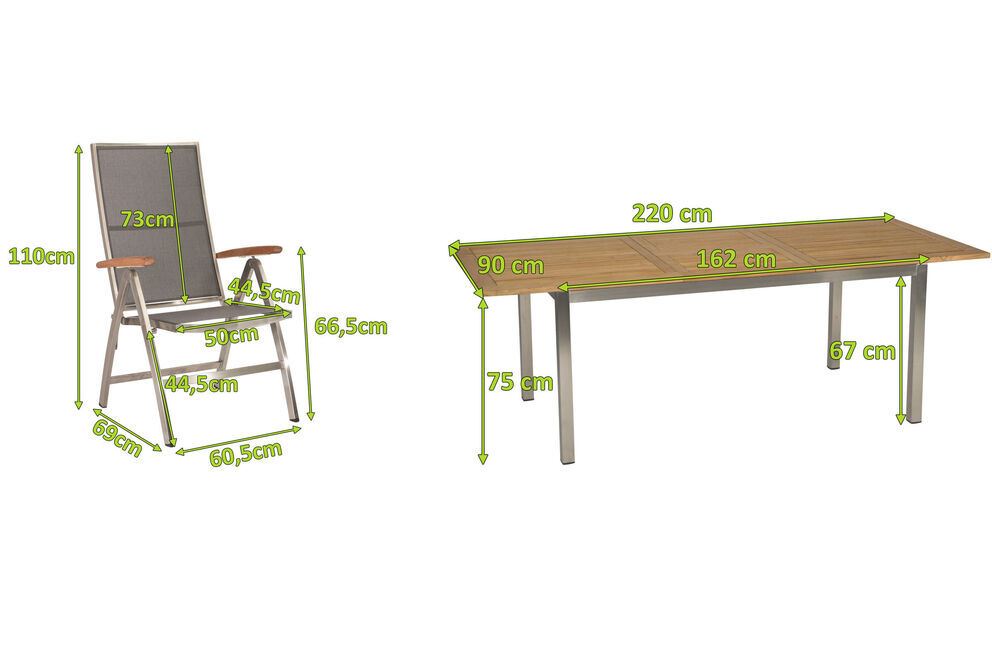Diese Garnitur wird Ihnen aufgrund der strapazierfähigen Materialien und der hochwertigen Verarbeitung ein langlebiger Begleiter im Garten sein, der Ihnen viele Sommer Freude bereiten wird.