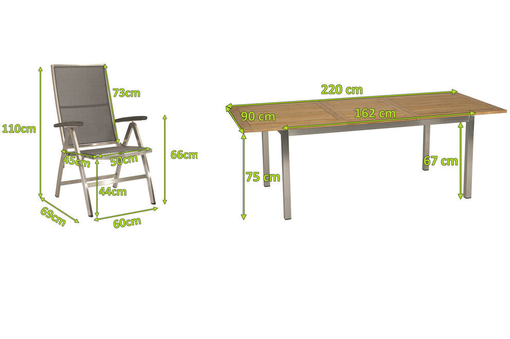Die dazu passend kombinierten Sessel überzeugen nicht nur mit das zeitlose Design und den hochwertigen Materialien, sondern vor allem auch durch den Komfort und die Funktionalität. Schlicht, unauffällig und dennoch ein Hingucker. So lässt sich der Cardiff wohl am besten beschreiben. Holen Sie sich mit diesem Sessel Eleganz vereint mit perfektem Sitzkomfort nach Hause und genießen Sie entspannte Stunden z.B. nach Ihrem Feierabend. Die hochwertigen Materialien und die sorgfältige Verarbeitung sorgen nicht nur für die besondere Optik dieses Stuhls, sondern machen ihn auch äußerst stabil. Der Cardiff wird Ihnen durch seine hohe Widerstandsfähigkeit gegen Wind und Wetter viele Jahre Freude bereiten. Das verwendete Edelstahl der Güteklasse 304 ist rostfrei und ebenso wie das Textilgewebe der Sitzfläche und Rückenlehne besonders pflegeleicht. Leichte Verschmutzungen lassen sich ganz einfach mit ein wenig Wasser wieder entfernen. Die Armlehnen sind aus Aluminium gefertigt und sind bei diesem Modell anthrazitfarben. So können Sie sich guten Gewissens zurücklehnen und sich so richtig entspannen. Durch seine Klappfunktion und den Maßen von ca. 69 x 60 x 110 cm lässt sich der Stuhl aber dennoch platzsparend verstauen, wenn Sie doch einmal etwas mehr Platz auf Ihrer Terrasse oder im Garten benötigen sollten.