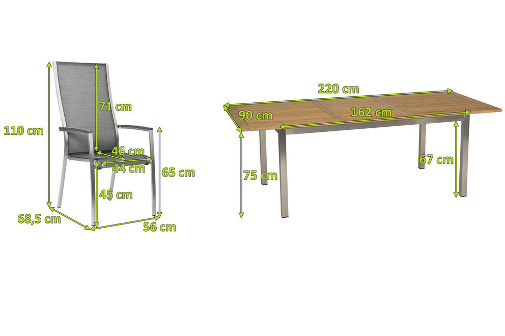 Der Hersteller setzt dabei, neben dem minimalistischen Design, vor allem auf besonders hochwertige Materialien. Diese sind dabei ebenso robust wie edel. Das beginnt schon beim stabilen Rahmen: Durch den Einsatz von Edelstahl kann nicht nur die Optik überzeugen, sondern auch die hohe Robustheit. Der Gartentisch bietet mit seinen Maßen von ca. 162/220 x 90 cm bei einer Höhe von ca. 75 cm ausreichend Platz, um gemeinsam schöne Stunden bei einem Brunch im Garten zu verbringen. Das Gestell aus Edelstahl der Güteklasse 304 gibt dem Tisch mit seinen ca. 5 x 5 cm starken Tischbeinen eine besonders hohe Stabilität. Die Tischplatte besteht aus Teakholz und lässt sich durch einen geschmeidigen Butterfly-Auszug problemlos von ca. 162 cm auf ca. 220 cm verlängern, sodass Sie zahlreiche Plätze für Gäste schaffen. Die hochwertige Materialauswahl und die sorgfältige Verarbeitung sorgen nicht nur für die exklusive Optik dieses Ausziehtisches, sondern machen den Tisch auch sehr stabil. Genießen Sie mit gutem Gewissen entspannte Stunden im Garten - Das für diesen Tisch verwendete Teakholz stammt damit aus verantwortungsvoll bewirtschafteten Quellen.