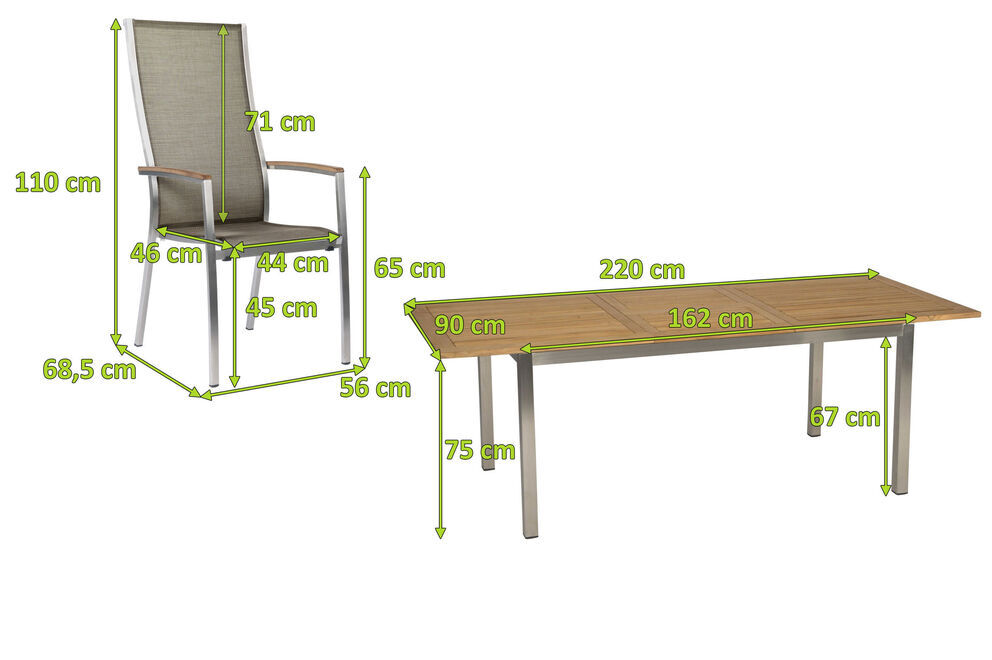 Der Hersteller setzt dabei, neben dem minimalistischen Design, vor allem auf besonders hochwertige Materialien. Diese sind dabei ebenso robust wie edel. Das beginnt schon beim stabilen Rahmen: Durch den Einsatz von Edelstahl kann nicht nur die Optik überzeugen, sondern auch die hohe Robustheit. Der Gartentisch bietet mit seinen Maßen von ca. 162/220 x 90 cm bei einer Höhe von ca. 75 cm ausreichend Platz, um gemeinsam schöne Stunden bei einem Brunch im Garten zu verbringen. Das Gestell aus Edelstahl der Güteklasse 304 gibt dem Tisch mit seinen ca. 5 x 5 cm starken Tischbeinen eine besonders hohe Stabilität. Die Tischplatte besteht aus Teakholz und lässt sich durch einen geschmeidigen Butterfly-Auszug problemlos von ca. 162 cm auf ca. 220 cm verlängern, sodass Sie zahlreiche Plätze für Gäste schaffen. Die hochwertige Materialauswahl und die sorgfältige Verarbeitung sorgen nicht nur für die exklusive Optik dieses Ausziehtisches, sondern machen den Tisch auch sehr stabil. Genießen Sie mit gutem Gewissen entspannte Stunden im Garten - Das für diesen Tisch verwendete Teakholz stammt damit aus verantwortungsvoll bewirtschafteten Quellen.