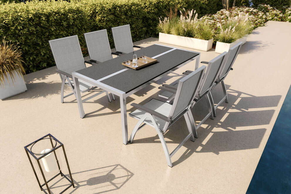 Die sechs klappbaren Cardiff Gartenstühle von STERN aus Edelstahl ergänzen das Set perfekt. Mit ihrer strapazierfähigen Textilene-Bespannung in Silber und Armlehnen aus Aluminium in Anthrazit verbinden sie modernes Design mit hohem Sitzkomfort. Die Rückenlehne der Stühle ist 6-fach verstellbar, sodass Sie jederzeit Ihre ideale Sitzposition finden können. Darüber hinaus überzeugt das Material durch seine Korrosionsbeständigkeit, wodurch die Stühle auch bei wechselnden Wetterbedingungen optimal geschützt sind. Dank ihrer Klappfunktion lassen sich die Stühle platzsparend verstauen, wenn sie nicht in Gebrauch sind.