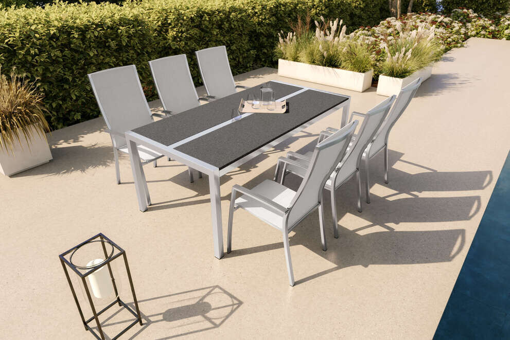 Diese Gartenessgruppe kombiniert innovative Materialien und clevere Funktionen, um Ihnen ein sorgenfreies Outdoor-Erlebnis zu bieten. Die widerstandsfähigen Materialien wie Edelstahl, Textilene und Keramik gewährleisten eine lange Nutzungsdauer, selbst bei anspruchsvollen Witterungsbedingungen. Die moderne Farbgebung in Silber und Graphite harmoniert perfekt miteinander und verleiht Ihrem Garten oder Ihrer Terrasse eine zeitlose Eleganz.