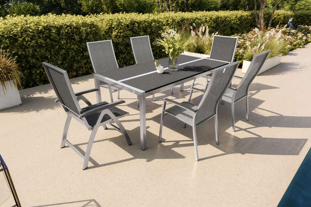 Mit der hochwertigen Cardiff Gartenessgruppe von STERN bringen Sie Stil, Komfort und Funktionalität in Ihren Außenbereich. Dieses Set, bestehend aus einem eleganten OUTFLEXX Gartentisch, vier stapelbaren Cardiff STERN Stühlen und zwei klappbaren Cardiff STERN Stühlen, überzeugt durch sein modernes Design, seine langlebigen Materialien und die durchdachte Konstruktion. Die Kombination aus Edelstahl, Aluminium, Keramik und Textilen macht dieses Set zu einem Highlight für Garten, Terrasse oder Balkon.
