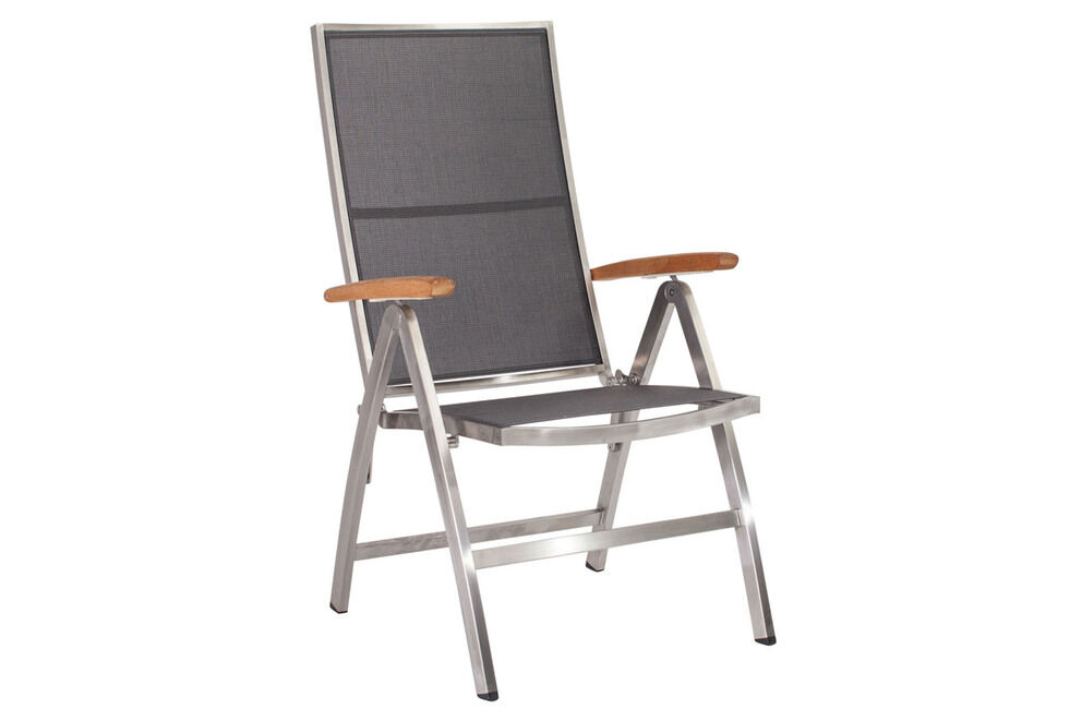 Der Sessel überzeugt nicht nur mit seinem zeitlosen Design und den hochwertigen Materialien, sondern vor allem auch durch seinen Komfort und seine Funktionalität. Schlicht, unauffällig und dennoch ein Hingucker. So lässt sich der Cardiff wohl am besten beschreiben. Holen Sie sich mit diesem Sessel Eleganz vereint mit perfektem Sitzkomfort nach Hause und genießen Sie entspannte Stunden z.B. nach Ihrem Feierabend. Die hochwertigen Materialien und die sorgfältige Verarbeitung sorgen nicht nur für die besondere Optik dieses Stuhls, sondern machen ihn mit einer Belastbarkeit von ca. 120 kg zusdem sehr stabil. Der Cardiff wird Ihnen durch seine hohe Widerstandsfähigkeit gegen Wind und Wetter viele Jahre Freude bereiten. Das verwendete Edelstahl der Güteklasse 304 ist rostfrei und ebenso wie das Textilgewebe der Sitzfläche und Rückenlehne besonders pflegeleicht. Leichte Verschmutzungen lassen sich ganz einfach mit ein wenig Wasser wieder entfernen. Das für die Armlehnen verwendete Teakholz stammt damit aus verantwortungsvollen Quellen. So können Sie sich guten Gewissens zurücklehnen und sich so richtig entspannen. Durch seine Klappfunktion und den Maßen von ca. 60 x 69 x 110 cm lässt sich der Stuhl aber dennoch platzsparend verstauen, wenn Sie doch einmal etwas mehr Platz auf Ihrer Terasse oder im Garten benötigen sollten.