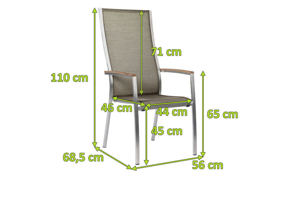 Der Sessel überzeugt nicht nur mit seinem zeitlosen Design und den hochwertigen Materialien, sondern vor allem auch durch seinen Komfort und seine Funktionalität. Schlicht, unauffällig und dennoch ein Hingucker. So lässt sich der Cardiff wohl am besten beschreiben. Holen Sie sich mit diesem Sessel Eleganz vereint mit perfektem Sitzkomfort nach Hause und genießen Sie entspannte Stunden z.B. nach Ihrem Feierabend. Die hochwertigen Materialien und die sorgfältige Verarbeitung sorgen nicht nur für die besondere Optik dieses Stuhls, sondern machen ihn auch äußerst stabil. Der Cardiff wird Ihnen durch seine hohe Widerstandsfähigkeit gegen Wind und Wetter viele Jahre Freude bereiten. Das verwendete Edelstahl der Güteklasse 304 ist rostfrei und ebenso wie das Textilgewebe der Sitzfläche und Rückenlehne besonders pflegeleicht. Die Sitzfläche hat die Farbe taupe und die Rückenlehne ist extra hoch, was für zusätzlichen Komfort sorgt. Leichte Verschmutzungen lassen sich ganz einfach mit ein wenig Wasser wieder entfernen. Das für die Armlehnen verwendete Teakholz stammt damit aus verantwortungsvollen Quellen. So können Sie sich guten Gewissens zurücklehnen und sich so richtig entspannen. Durch seine Stapelfunktion und den Maßen von ca. 68,5 x 56 x 110 cm lässt sich der Stuhl aber dennoch platzsparend verstauen, wenn Sie doch einmal etwas mehr Platz auf Ihrer Terrasse oder im Garten benötigen sollten.