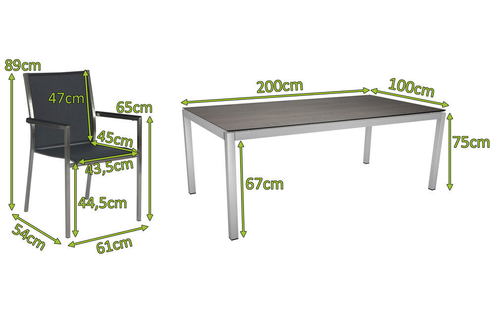 Der Gartentisch bietet mit seinen Maße von ca. 200 x 100 cm bei einer Höhe von ca. 75 cm ausreichend Platz für bis zu sechs Personen, um gemeinsam schöne Stunden bei einem Brunch im Garten zu verbringen. Das Gestell aus Edelstahl der Güteklasse 304 gibt dem Tisch mit seinen ca. 5 x 5 cm starken Tischbeinen eine besonders hohe Stabilität. Die sorgfältig verarbeitete ca. 1,5 cm dicke Tischplatte Silverstar 2.0 ist besonders witterungsbeständig und hält wie die anderen Materialien sowohl Frost und Hitze als auch Feuchtigkeit und Regen aus. Die Stapelsessel verfügen wie das Tischgestell über ein Gestell aus Edelstahl der Güteklasse 304, auf welches ein formstabiles und reißfestes Textilgewebe in silbergrau aufgespannt wurde. Sowohl das Stuhlgestell als auch das Textilgewebe sind UV-stabil, wetterfest und damit pflegeleicht. Mit Maßen von ca. 61 x 54 x 89 cm und einem geringen Gewicht lassen sich die Stühle ganz leicht hin und her stellen. Gleichzeitig bieten sie die nötige Stabilität und dank der durchgehenden Sitz- und Rückenfläche einen hervorragenden Sitzkomfort. Die Fußkappen aus Kunststoff schützen den Boden vor unschönen Kratzern beim Verrücken der Stühle. Bei Bedarf können Sie die Stühle einfach stapeln und somit platzsparend verstauen.