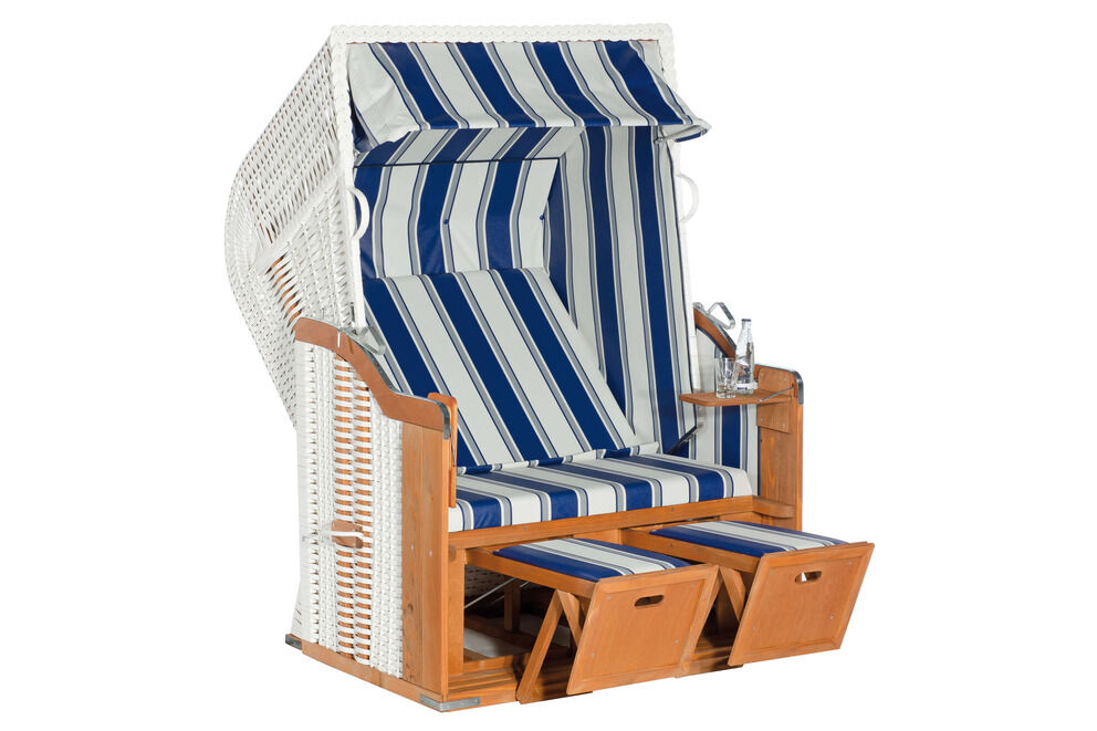| ✔ | Stabile & robuste Bauweise Der Strandkorb ist aus massivem, lasiertem Fichtenholz und hochwertigem Kunststoffgeflecht gefertigt. Mit einem Gewicht von ca. 70 kg ist er besonders standfest und überzeugt durch seine langlebige Qualität. |