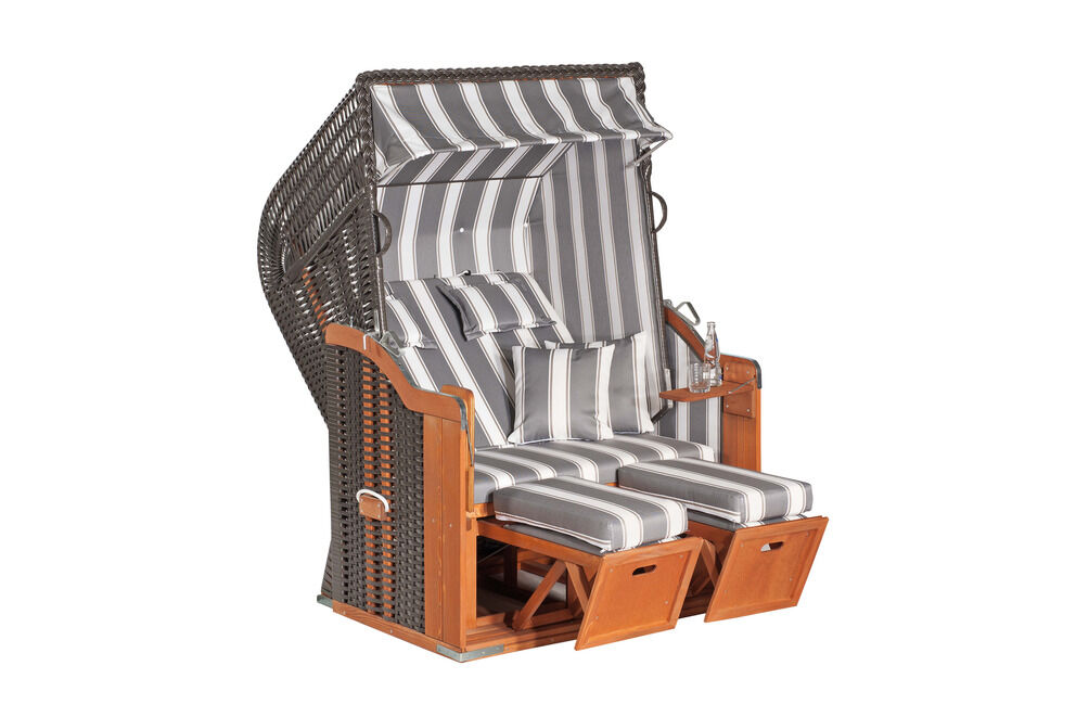 Ein weiteres Highlight ist die massive, einteilige Flechtung des Oberkorbs, die nicht nur für eine edle Optik sorgt, sondern auch die Stabilität des Strandkorbs erhöht. Durch die fixe und fertig montierte Anlieferung müssen Sie den Strandkorb nur noch an Ihrem Lieblingsplatz aufstellen und sofort genießen.