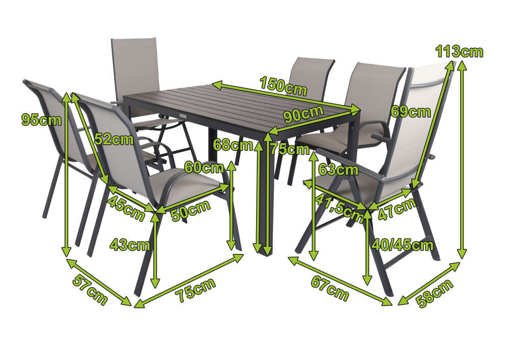 Diese Esstischgarnitur besteht aus 4 bequemen Stapelstühlen, 2 Klappstühle und einem Gartentisch - perfekt, für eine gemütliche Runde aus Freunden, Familie oder Nachbarn. Bei Bedarf können Sie diese Gruppe mit passenden Artikeln der VILLANA Serie erweitern. Der optisch zeitlose Esstisch hat Maße von ca. 150 x 90 x 75 cm und besitzt ein Gestell aus pulverbeschichtetem Aluminium in der Farbe Anthrazit. Aluminium ist ein gern verwendetes Material im Gartenmöbelsektor, da es besonders leicht, zeitgleich jedoch sehr stabil ist. Dazu kommt der geringe Pflegeaufwand durch die Pulverbeschichtung. Die meisten Verschmutzungen lassen sich unkompliziert mit Wasser aufweichen und anschließend abspülen oder mit einem weichen Schwamm entfernen. Das gewisse Etwas erhält der Esstisch durch seine Tischplatte in der Farbe Schwarz. Das Holzimitat schafft Ihnen die Optik von Holz, hat aber den geringen Pflegeaufwand von Kunststoff und ist zudem wetterfest. Die ca. 2 cm dicke Tischplatte bildet ein zuverlässiges Element des Tisches. Die geschickte Kombination von modernen Materialien ermöglicht ein geringes Gewicht von gerade einmal ca. 18,7 kg mit einer maximale Belastbarkeit von ca. 50 kg. Mit der Tischunterkante in Höhe von ca. 68 cm lassen sich die Stühle problemlos unter die Tischplatte schieben.