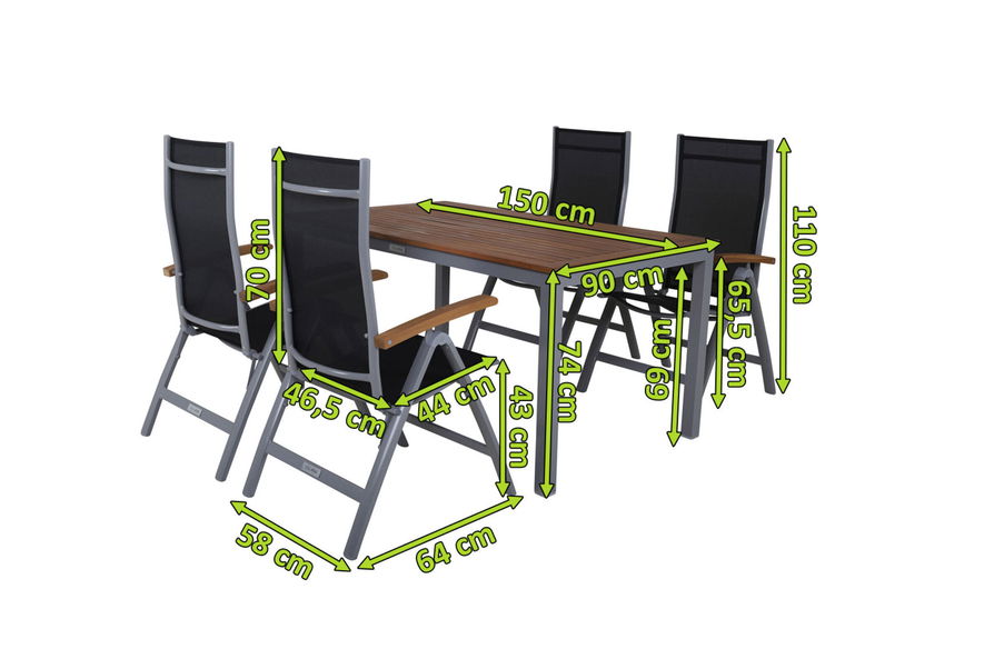 Diese Villana Esstischgruppe bietet genügend Platz für vier Personen und besitzt auch in Sachen Komfort und Verarbeitung nur die beste Qualität. Die Farb- und Materialkombination aus Silber, Schwarz, Aluminium, Textilene und FSC-Akazienholz sorgt für eine rustikale Eleganz, welche die vielfältige Kombination mit anderen Möbelstücken oder Dekoration ermöglicht. Der Gartentisch von Villana bietet Ihnen mit einer Länge von ca. 150 cm und einer Breite von ca. 90 cm genügend Platz, um reichlich bestückt zu werden. Mit seiner Höhe von ca. 74 cm besitzt dieser Tisch eine ideale Wohlfühlhöhe. Der Tisch wiegt ca. 17 kg und die Tischplatte weist neben einem neuen Design, eine verbesserte Stabilität auf. Die Tischplatte ist ca. 20 mm dick. Das hochwertige Aluminiumgestell wurde sowohl bei dem Esstisch als auch bei den Stühlen pulverbeschichtet und kommt in einem eleganten Silber daher. Die Pulverbeschichtung sorgt für längere Haltbarkeit und Witterungsbeständigkeit.