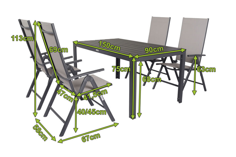 Diese Esstischgarnitur besteht aus 4 bequemen Sesseln und einem Gartentisch - perfekt, für eine kleine Runde aus Freunden, Familie oder Nachbarn. Bei Bedarf können Sie diese Gruppe mit passenden Artikeln der VILLANA Serie erweitern. Der optisch zeitlose Esstisch hat Maße von ca. 150 x 90 x 75 cm und besitzt ein Gestell aus pulverbeschichtetem Aluminium in der Farbe Anthrazit. Aluminium ist ein gern verwendetes Material im Gartenmöbelsektor, da es besonders leicht, zeitgleich jedoch sehr stabil ist. Dazu kommt der geringe Pflegeaufwand durch die Pulverbeschichtung. Die meisten Verschmutzungen lassen sich unkompliziert mit Wasser aufweichen und anschließend abspülen oder mit einem weichen Schwamm entfernen. Das Holzimitat schafft Ihnen die Optik von Holz, hat aber den geringen Pflegeaufwand von Kunststoff und ist zudem wetterfest. Die ca. 2 cm dicke Tischplatte bildet ein zuverlässiges Element des Tisches. Die geschickte Kombination von modernen Materialien ermöglicht ein geringes Gewicht von gerade einmal ca. 18,7 kg mit einer maximale Belastbarkeit von ca. 50 kg. Mit der Tischunterkante in Höhe von ca. 68 cm lassen sich die Stühle problemlos unter die Tischplatte schieben.