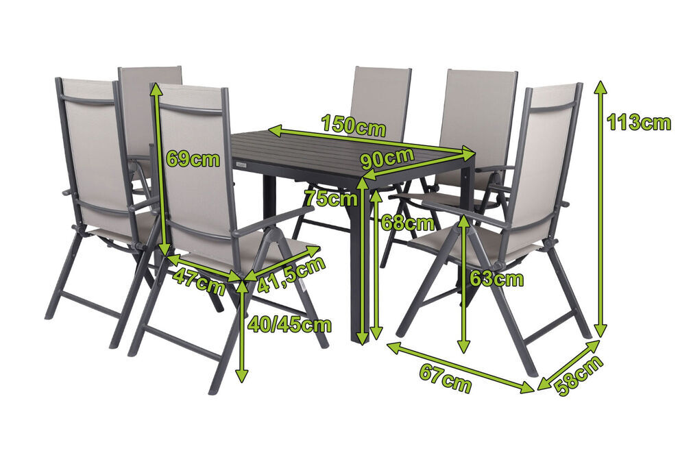 Diese Esstischgarnitur besteht aus einem Gartentisch und 6 bequemen Sesseln - perfekt, für eine gemütliche Runde aus Freunden, Familie oder Nachbarn. Bei Bedarf können Sie diese Gruppe mit passenden Artikeln der VILLANA Serie erweitern. Die Klappstühle sind modern und praktisch zugleich! Die Sessel haben ein Gestell aus pulverbeschichtetem Aluminium in der Farbe Anthrazit und Maße von jeweils ca. 67 x 58 x 113 cm. Aluminium ist ein gern verwendetes Material im Gartenmöbelsektor, da es besonders leicht, zeitgleich jedoch sehr stabil ist. Dazu kommt der geringe Pflegeaufwand durch die Pulverbeschichtung. Die meisten Verschmutzungen lassen sich unkompliziert mit Wasser aufweichen und anschließend abspülen oder mit einem weichen Schwamm entfernen. Bei Nichtgebrauch lassen sich die Sessel stapeln und platzsparend verstauen. Dazu ist das Leichtgewicht mit ca. 4,3 kg besonders stabil und beeindruckt mit einer maximalen Belastbarkeit von ca. 130 kg. Dabei kommt der Komfort nicht zu kurz! Die geteilte Sitz- und Rückenfläche ist mit dem modernen Material Textilene (70% Polyvinylchlorid, 30% Polyester) in der Farbe Grau bespannt. Das Kunststoffgewebe zeichnet sich vor allem durch seine hohe Belastbarkeit und seinen hohen Komfort aus. Zudem ist es frost- und hitzebeständig, was zusammen mit der hohen Lichtbeständigkeit für eine lange Attraktivität Ihrer Sitzmöbel sorgt. Auch nimmt Textilene kaum Feuchtigkeit auf, so dass die Sitzfläche nach einem Regenschauer schnell wieder trocken ist. Mit einer Sitzbreite von ca. 47 cm und einer Sitztiefe von ca. 41,5 cm wollen Sie aus diesem Stuhl gar nicht mehr aufstehen! Für das Plus an Komfort bietet Ihnen der Klappstühle eine 8-fach verstellbare Rückenlehne - lehnen Sie sich zurück und lassen Sie die Alltagssorgen hinter sich.